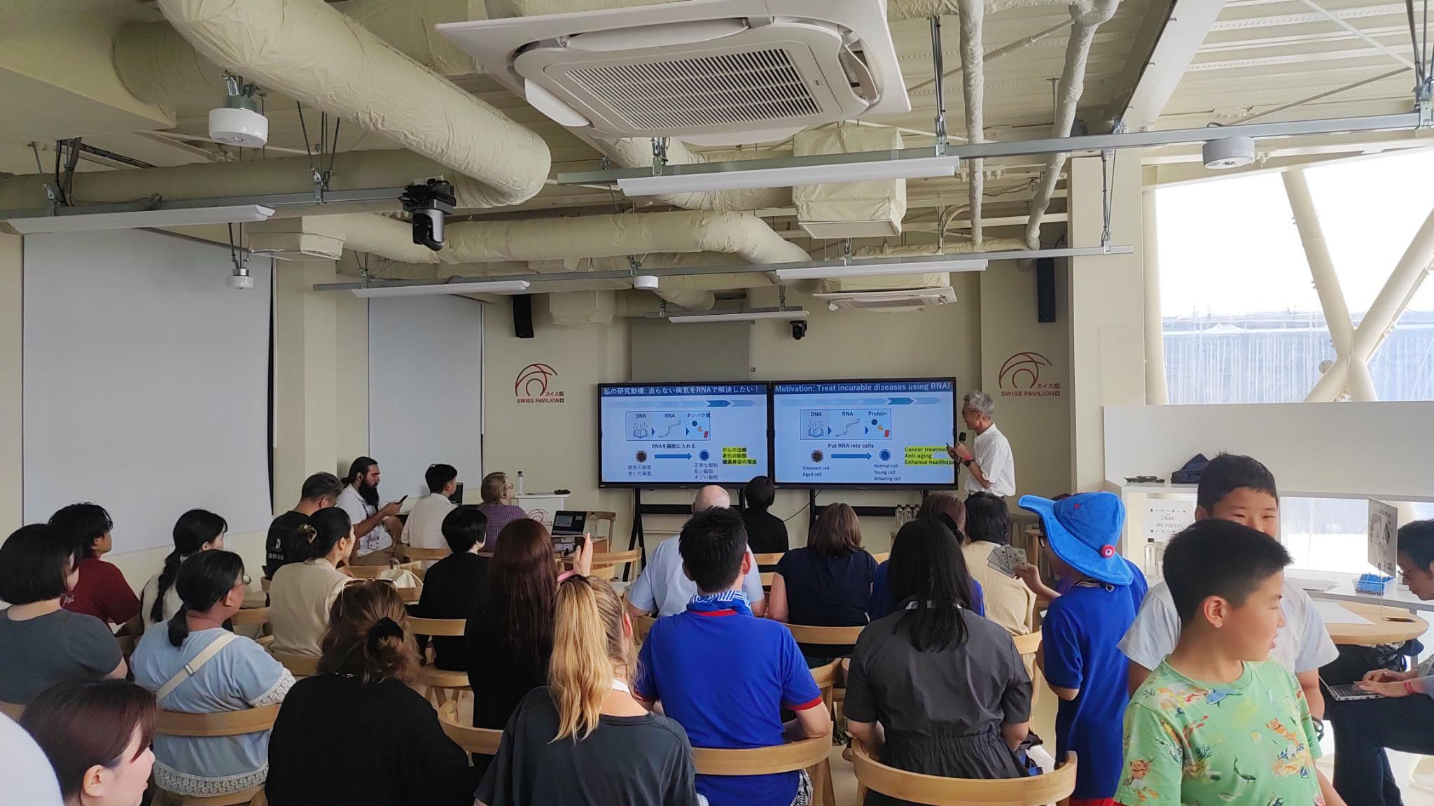 The Science Café, organized by Kyoto University’s CiRA in collaboration with UZH’s Institute for Regenerative Medicine (IREM), Wyss Zurich, and the CiRA Foundation, was a standout feature of the Swiss Pavilion – one of the most visited and popular national pavilions at this year’s Expo. Designed to foster dialogue beyond the scientific community, the event offered the public, researchers, and industry stakeholders a unique opportunity to engage directly with experts. Through presentations, panel discussions, and interactive sessions, participants explored how cutting-edge technologies, including iPS cells, genome editing, organoids, and gene therapy, could address today’s pressing medical challenges. What set the event apart was its accessible approach: using analogies, visuals, and hands-on tools, researchers translated complex scientific concepts into tangible and relatable experiences.